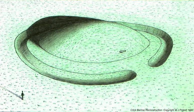 speculative reconstruction drawing of the Crick bell-barrow, viewed from the