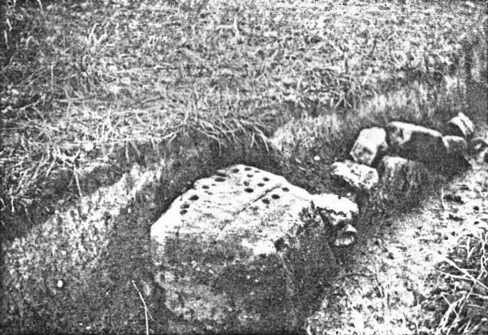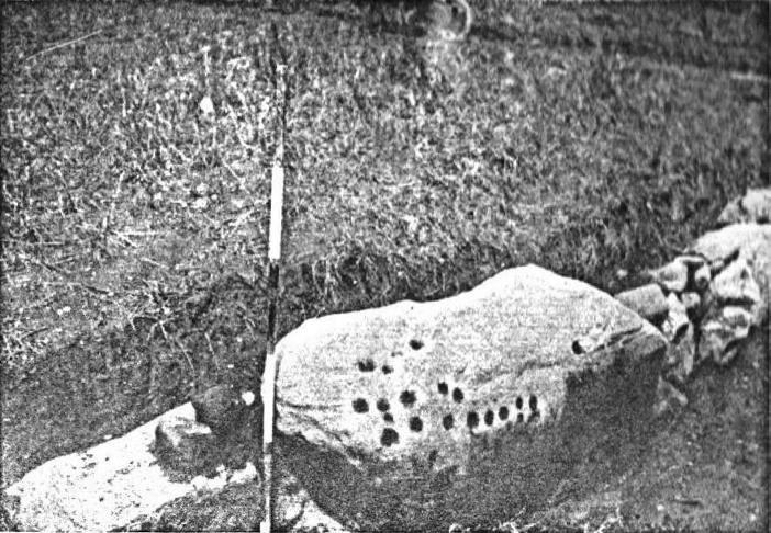 Plates 1 and 2 The two cup-marked boulders contained within the Crick bell-barrow (click on thumbnails for larger versions, 90 KB and 95 KB). (Left) The South-eastern cup-marked boulder, with 23 cup-marks and (Right) the cup-marked boulder in the North-eastern quadrant of the stone ring, with 17 cup-marks on its upper surface (both plates are reproduced from 'Archaeologia Cambrensis', Vol. XCV (1940), available online at the National Library of Wales website). |