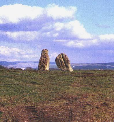 The two stones at Cefn Cribwr (98 KB) near Pyle, Mid Glamorgan (SS 873 826) stand in marshy ground and at the time of the author's last visit (1990) they were not intervisible because of intervening trees. There are a number of partly submerged boulders lying close to the Western stone which may have once formed an alignment, or even a stone circle. The Royal Commission suggests they might even be boundary markers from recent times (RCAHMW 1976, 123). Just across the border in Carmarthenshire, two stones on Mynydd Myddfai beside the Usk reservoir (SN 806 284) are far apart and they may not have originally had any intended relationship with each other.