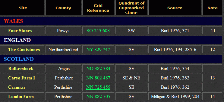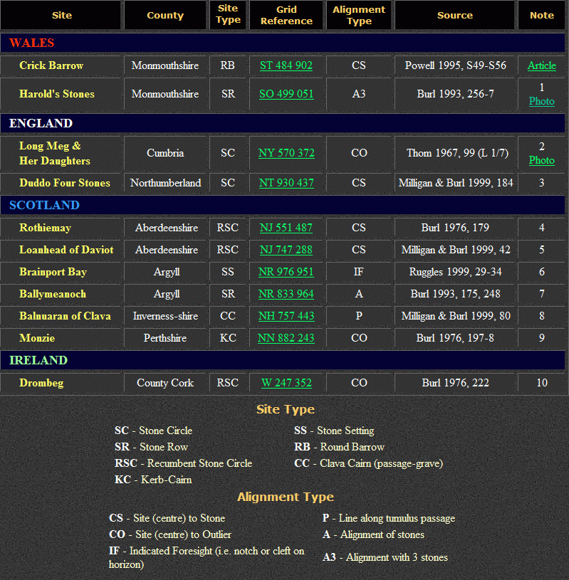 Table listing British and Irish sites dating from the later Neolithic and Bronze Age periods with decorated stones which are thought to include alignments towards the Winter Solstice sunrise/sunset (click for full-size table, 135 KB). The book references shown in the 'Source' column, and the reference numbers shown in the 'Notes' column, are listed in their respective sections below.
