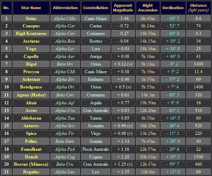 The twenty-one brightest stars in the night sky are listed in the table above (click for full-size image, 70 KB). The letter 'v' in brackets indicates that the star has a variable brightness (Sources: "The Guinness Book of Astronomy Facts & Feats" by Patrick Moore (Guinness, Enfield, 1983) and "Norton's Star Atlas" edited by Ian Ridpath (Longman, London, 1989)