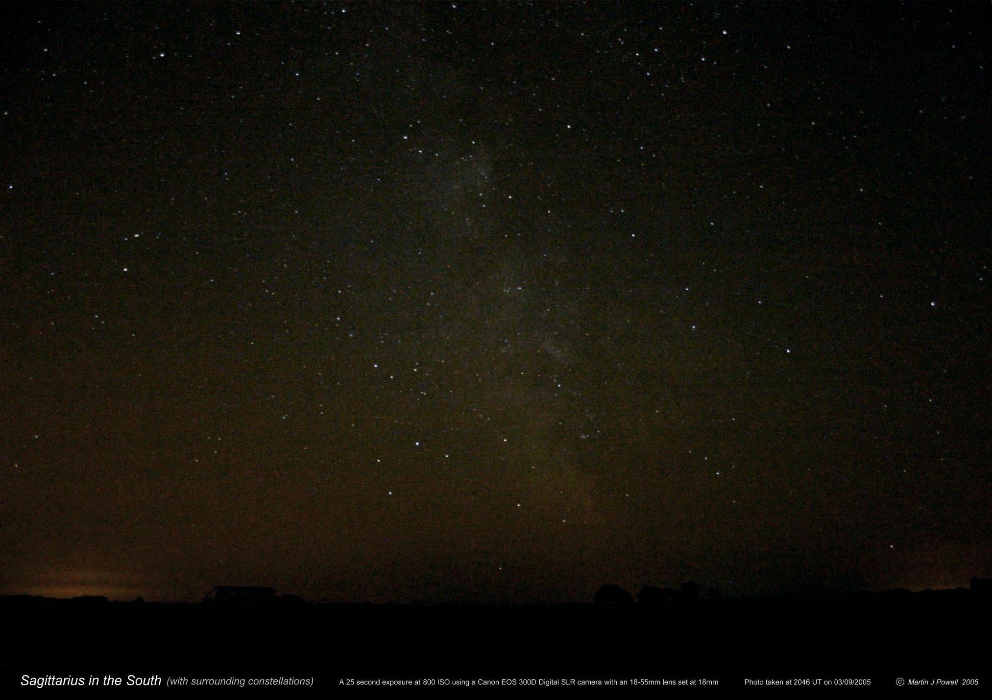 Sagittarius is home to a wealth of interesting astronomical objects. This is mainly due to the fact that, when we look at Sagittarius, we are looking towards the centre of our own Milky Way Galaxy, where the density of stars and gas/dust clouds (nebulae) is greatest. Indeed, the actual centre of the galaxy is located at the South-eastern corner of the constellation, hidden behind dark clouds of interstellar dust, close to the boundary with Scorpius. Under dark skies, the Milky Way glows distinctly in the region of Sagittarius and its neighbour Scutum - an impressive sight now sadly lost to many town and city dwellers due to the effects of light pollution or skyglow (140 KB).