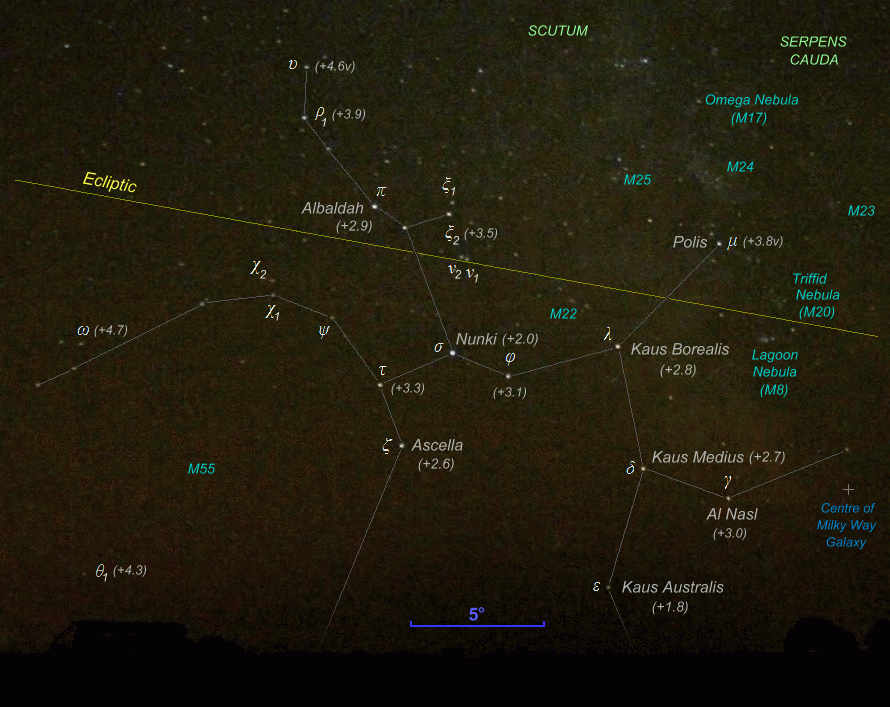 Sagittarius is not visible all year round because, from the vantage point of the Earth in its orbit, the Sun is seen to pass through the constellation during the Northern hemisphere midwinter period (equivalent to the midsummer period in the Southern hemisphere). Because the Sun passes through Sagittarius, it is by definition one of the twelve (technically thirteen) constellations of the zodiac. Sagittarius is the most Southerly of the zodiac constellations, the Sun being positioned here at the Northern hemisphere winter solstice (the summer solstice in the Southern hemisphere) on December 21st-22nd each year (for more details on the movement of the Sun and the planets through the zodiac - including diagrams of the entire zodiac - see the author's planet movements page).