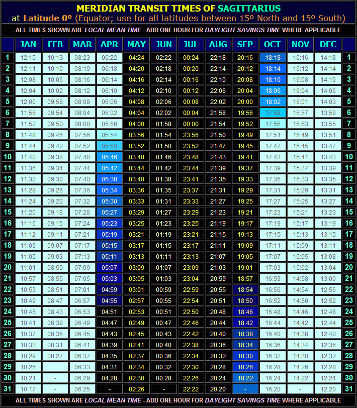 Meridian transit times of Sagittarius throughout the year are given in the Meridian Transit table below. The table is colour-coded to reflect the sky colour at the displayed time (because of local seasonal variations, a table is given for a Northerly, an Equatorial (85 KB) and a Southerly (83 KB) latitude - select whichever is applicable to your own latitude).