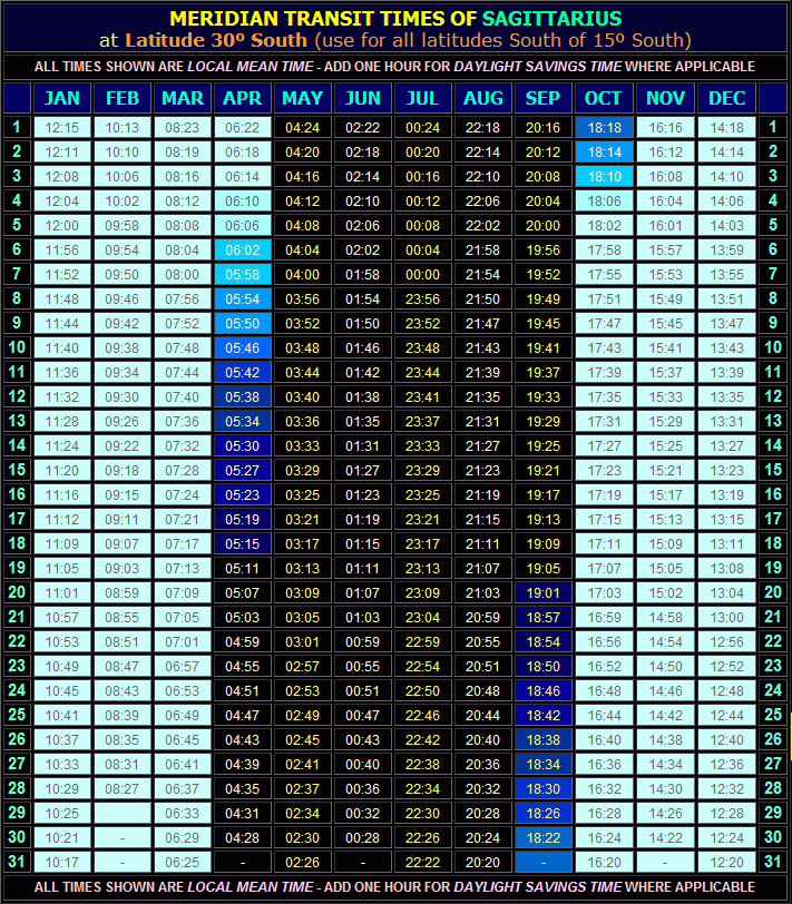 Meridian Transit Times of the constellation Sagittarius for each day of the year, shown in 24-hour clock format (hours:mins) (click for full-size table, 88 KB). All times are shown in Local Mean Time; if your country operates Daylight Savings Time (DST) during the summer months, ADD ONE HOUR to the times shown on the appropriate dates. All positions refer to a star located on the ecliptic in central Sagittarius at Right Ascension 19h 00m 3.485s, Declination -22º 42' 39".56 (this point is indicated in the animations/diagrams by a small yellow cross [+]). The times refer specifically to the central longitude of any given time zone (the time zone meridian); hence for any location on the globe, they will be accurate to within plus or minus (±) 30 minutes. For higher accuracy (to within about 4 minutes), refer to the page Finding the Local Standard Time (LST) from the Local Mean Time (LMT).