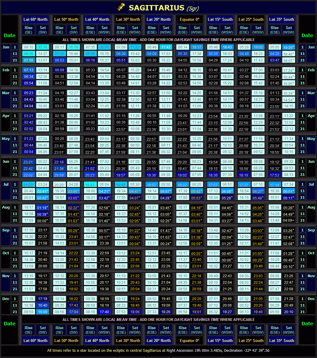 The following table lists the rising and setting times of Sagittarius for a variety of latitudes (times are listed for the 1st, 11th and 21st day of each month - to obtain the times at intermediate dates, apply the 'four minutes per day' rule discussed above). The times displayed are in Local Mean Time (LMT); ADD ONE HOUR to the times if your country operates Daylight Savings Time (DST) during the local summer months.