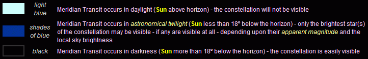 The table is colour-coded to reflect the sky colour at the displayed time, applicable to latitude 40º North. This table should be used for all observers North of about 15º North; observers between latitudes 15º North and 15º South should use the Equatorial Meridian Transit table (85 KB). whilst those situated South of 15º South should use the 30º South Meridian Transit table (83 KB). Note that the transit times are the same in all of the tables, but the sky colours vary somewhat for each latitude because of seasonal variations.
