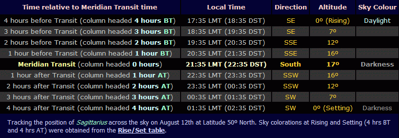 Tracking the position of Sagittarius across the sky on August 12th at Latitude 50º North (click for full-size table, 30 KB). Sky colorations at Rising and Setting (4 hrs BT and 4 hrs AT) were obtained from the Rise/Set table below.