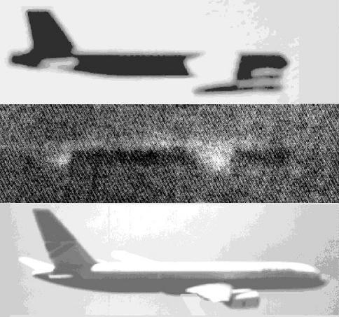 of a Boeing B-52 (top) and a 757 (bottom) aside a contrast-enhanced image