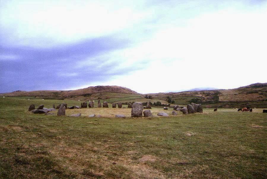 Two outlying portal stones form an 'entrance' 9 ft (2.7 m) wide at the South-east, which Alexander Thom believed was aligned on the rising of the midwinter sun over a nearby hill during the Bronze Age. Fragments of charcoal and burnt bone were the only findings during an exacavation in 1901. |