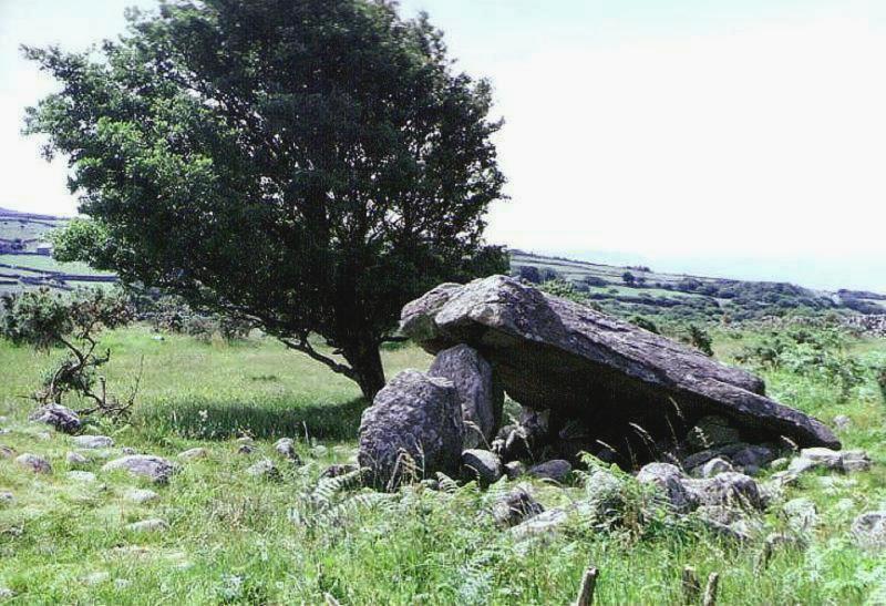 A capstone measuring 11½ ft (3.5 m) long by 10 ft (3 m) wide partly rests on a single orthostat. The chamber was probably rectangular in form and it occupies the Eastern end of a denuded long mound about 85 ft (26 m) long by 39 ft (12 m) wide. There are traces of a forecourt structure ahead of the orthostat. |