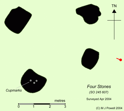 Four Stones Stone Setting County: Powys (Radnorshire) O.S. Grid Ref: SO 246 608 O.S. Map (Streetmap) Site Plan (21 KB) Photo Size: 152 KB / Date: April 2004