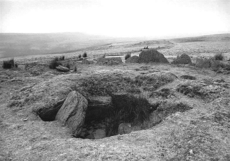 The tomb comprises chlorite schist rocks which were obtained from the immediate surroundings. The cairn originally measured about 200 ft (60 m) long by 50 ft (15 m) wide. In the excavator's opinion, the surrounding ridges of projecting rock appear to have determined the tomb's size and orientation (NE-SW), the chambers themselves occupying the North-eastern end. The huge portal stone - visible towards the right of the picture - is 8½ ft (2.6 m) long, 2½ ft (0.7 m) thick and stands about 9½ ft (2.9 m) above the present surface level. A second portal once stood some 8 ft (2.5 m) further North; only its base was found during excavation, the upper section having sheared off at some time in the distant past. These two stones marked the entrance to a series of three (possibly four) chambers which stretched along a length of about 41 ft (12.5 m). Only the Westernmost chamber has survived; its internal dimensions were originally about 9 ft 10 in (3 m) by 3 ft 3 in (1 m) and it would have stood about 6½ ft (2 m) high; now only a side-supporter is visible (left of picture). The chamber's capstone partly rests on this slab, having slipped forward at some time prior to 1871. Excavation also revealed a pair of post-holes at the entrance to one of the chambers; these may have supported some kind of wooden mortuary structure which existed prior to the chamber's construction. Finds from the excavations included the cremated bone fragments of two adults, pieces of Neolithic pottery, part of a polished stone axe and pieces of waste flint. |