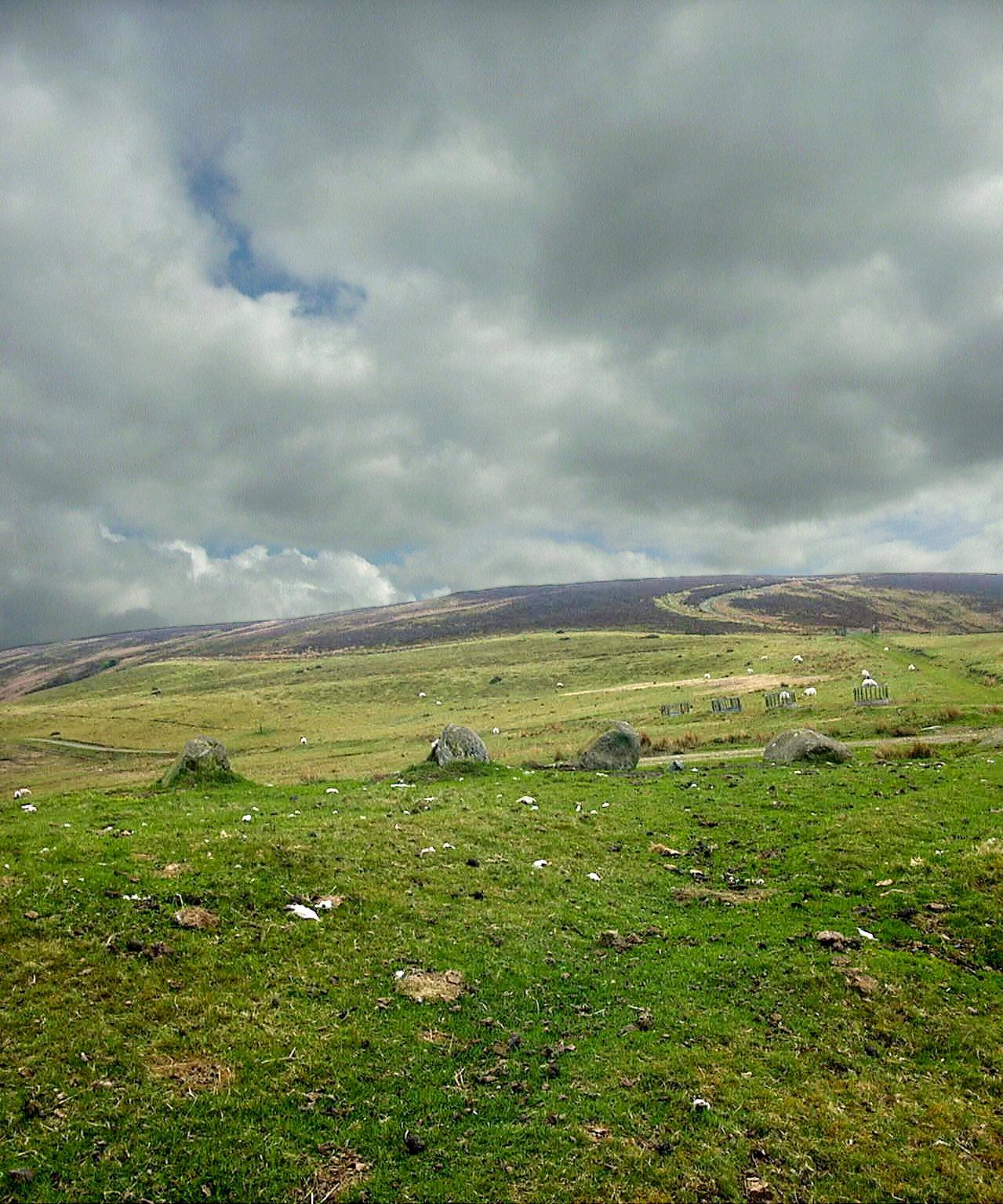 Although the name of the site refers to the presence of four stones ('pedwar maen'), there appear to be five stones in this row, the fifth being at the South-western end; it is now recumbent and largely submerged in the turf. The five stones form a NE-SW line about 52 ft (16 m) in length. From Northeast to Southwest the heights of the four visible stones are: 1 ft 6 in (0.46 m), 1 ft 6 in (0.46 m), 2 ft (0.61 m) and 2 ft 6 in (0.76 m). The original standing height of the now-submerged stone is not known. Interestingly, the measurable stones are graded in height towards the South-west. When extended towards the North-east the row points to a tumulus (a round barrow or cairn) some 200 ft (60 m) away, which may be associated with it. Modern trackways converge next to the row. |