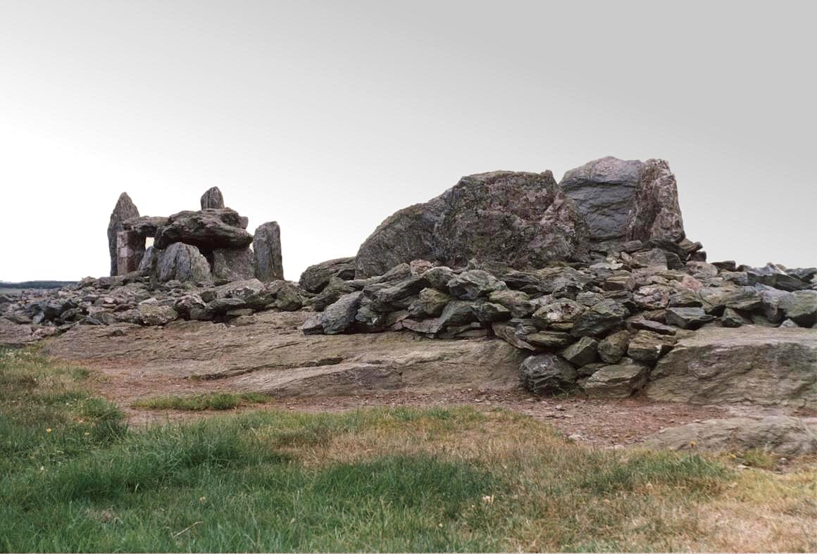The main chamber is 13 ft (4 m) long by 6½ ft (2 m) wide, made of six uprights. The Southern chamber opens from the main chamber and measures 8½ ft (2.6 m) by 4½ ft (1.4 m). The capstone has been displaced from its original position. There was probably a third chamber on the Northern side and possibly a covering cairn, but they are obscured by a sand dune. There were minor excavations in 1860 and 1881. A human jaw fragment, animal bones, a piece of a bone tool handle and pieces of pottery were recovered from the Southern chamber [Ast] |