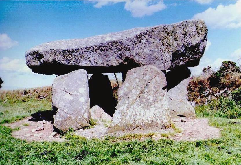 Three orthostats standing 4 ft (1.2 m) tall support a wedge-shaped capstone 10 ft (3 m) long, 6½ ft (2 m) wide and ca.4 ft (1.2 m) thick. A fourth stone lies prostrate nearby, which may originally have been a fourth upright, according to a 1693 account of the site. The chamber is orientated just to the South of East. Archaeologist Frances Lynch considers the site peculiar in its class, due in part to the "odd angle at which the portal stones are set, neither well-aligned to the chamber nor parallel to one another." A local legend says that St Samson hurled the stones to this spot from the summit of Carn Ingli. |